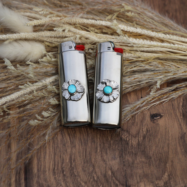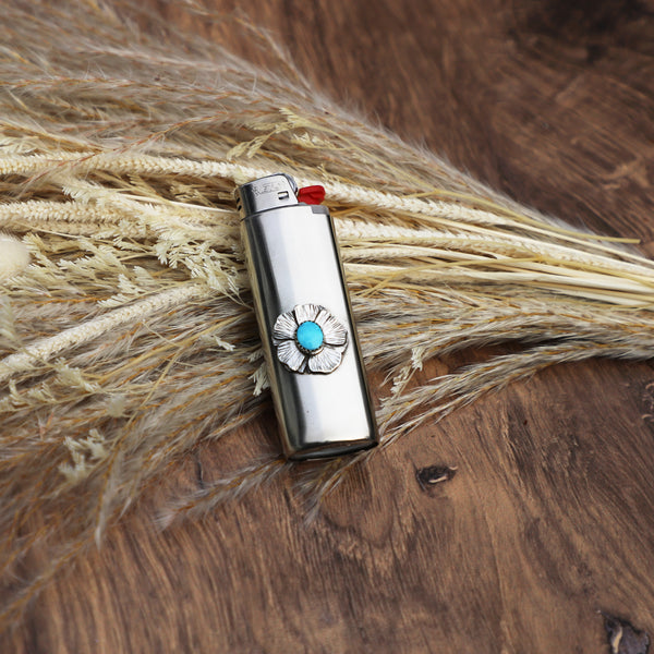 These refillable Nickel and Sterling lighter cases are dressed up with a hand-forged STERLING SILVER flower, each one centered around a vibrant piece of ethically mined turquoise. Whether you’re lighting a candle, a joint, or just trying to find your way to the snacks in the dark, this beauty brings a little magic to every flick.