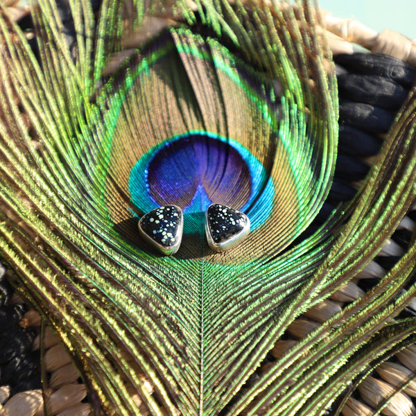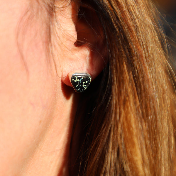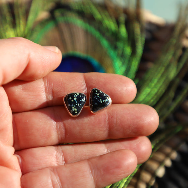 These tiny triangle show-stealers are packing galactic realness in a size your minimalist self can get behind. Featuring ethically sourced Poseidon Variscite (aka: if the Milky Way and mint chip ice cream had a baby), bezel-set in FINE + RECYCLED STERLING SILVER that I handcrafted with love, fire, and a lot of tiny tools.