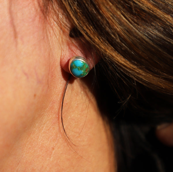 These slim Kingman Turquoise studs bring just enough attitude without raising their voice. Ethically sourced KINGMAN TURQUOISE—all sky-blue with those perfectly imperfect natural markings—bezel-set in FINE + RECYCLED STERLING SILVER, handcrafted by me with patience, fire, and a truly unreasonable number of tiny tools.