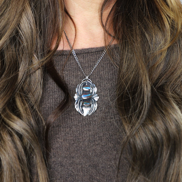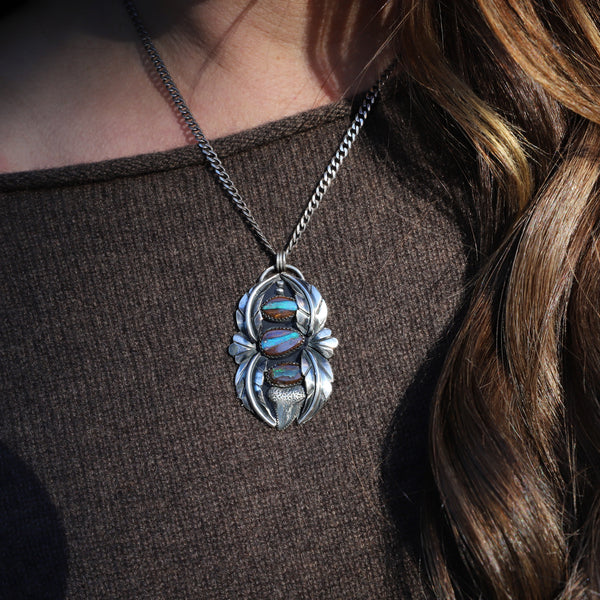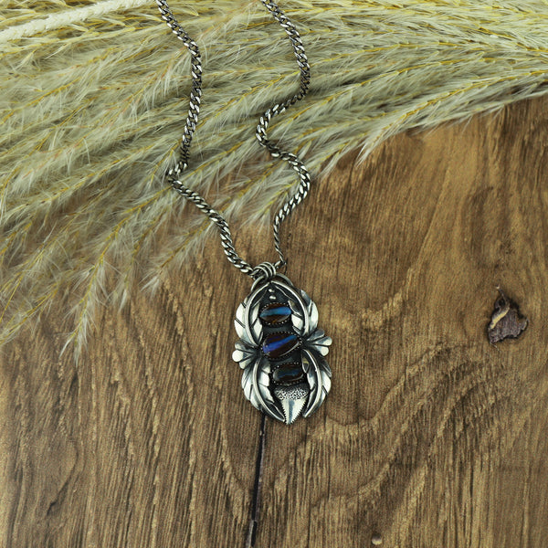 The one-of-a-kind pendant features Australian opals that shimmer like moonlight on waves, and a hand-forged sterling silver shark tooth (ethically made, no sharks harmed—just vibes honored), flanked by. Delicate, hand-forged sterling leaves frame the piece like a love letter to the Mother Nature.