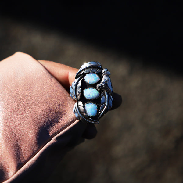 This one-of-a-kind statement ring features a trio of glowing AUSTRALIAN OPALS, catching the light like moonrise on water—each stone nestled in a garden of hand-forged STERLING SILVER leave and a sterling shark tooth cast in recycled silver—full of power and history, set like a secret talisman.