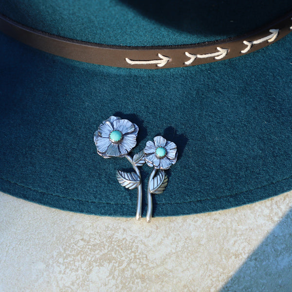 Meet your new favorite way to dress up your crown. Each handcrafted STERLING SILVER flower clip features ethically sourced TURQUOISE and a custom no-damage clip backing that hugs your brim like it was born to. No holes, no drama — just vibes. It’s like your hat put on lipstick and decided to flirt with strangers at the farmer’s market.