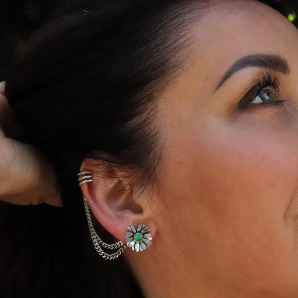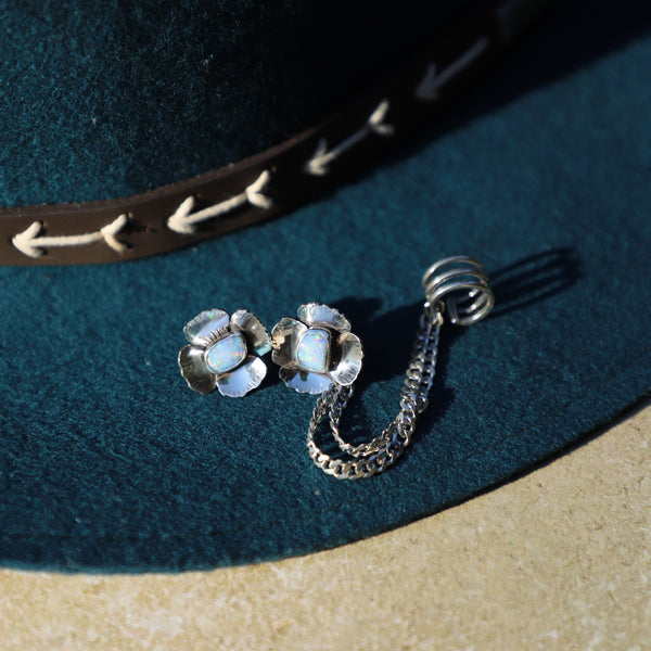 These hand-forged recycled STERLING SILVER poppy studs are set with fiery AUSTRALIAN OPALS that shine like cosmic disco dust. One stud connects to a double STERLING curb chain that loops up to a sleek, no-piercing-required ear cuff, adding a playful, unexpected twist that feels equal parts rock show and ritual. You can wear them as-is with the included opal studs or mix things up and pair the chain with a different favorite stud—these are made to be styled your way, no rules required.